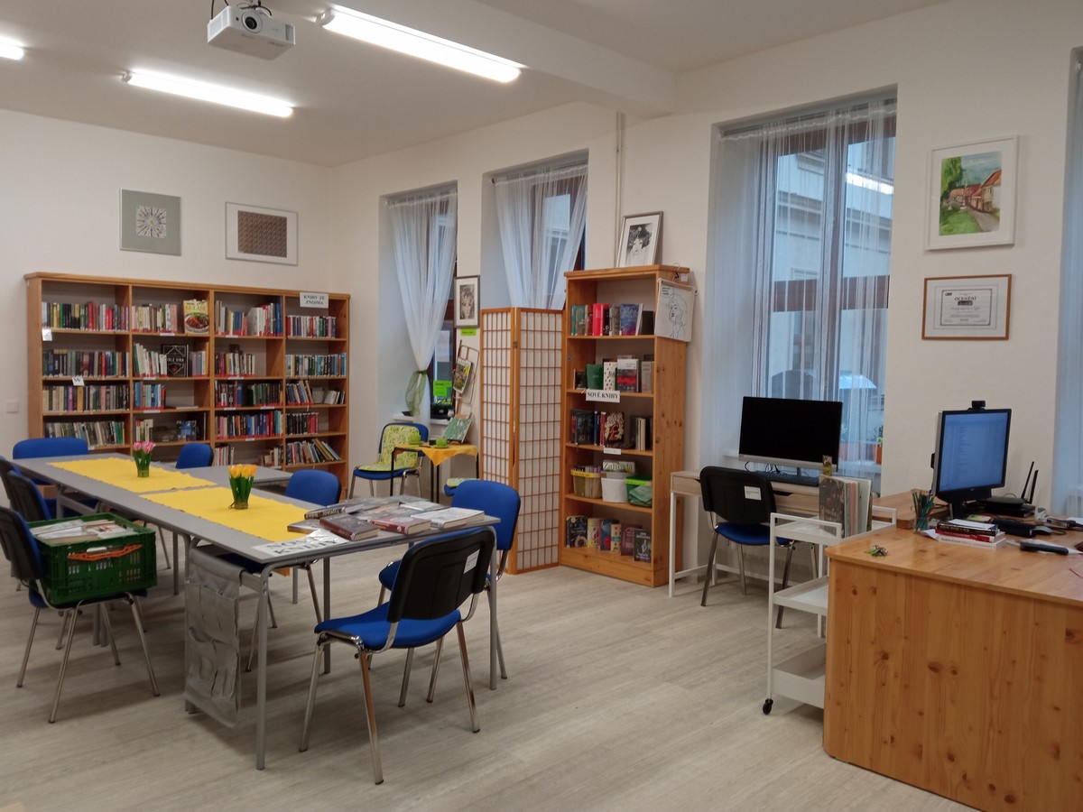 Knihovna sídlí v Domě s chráněnými byty č.p. 11 v přízemí (vchod je od kostela).