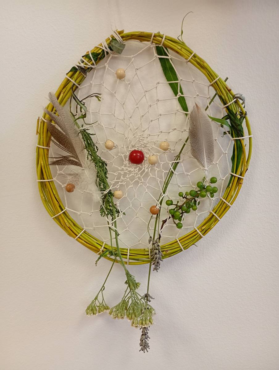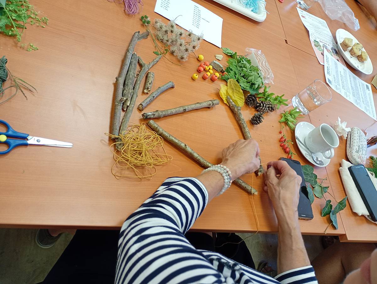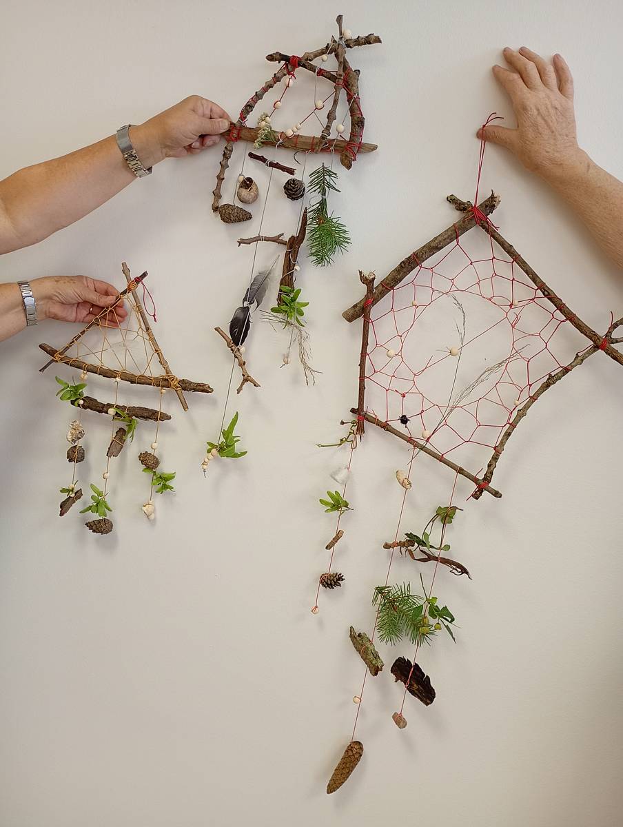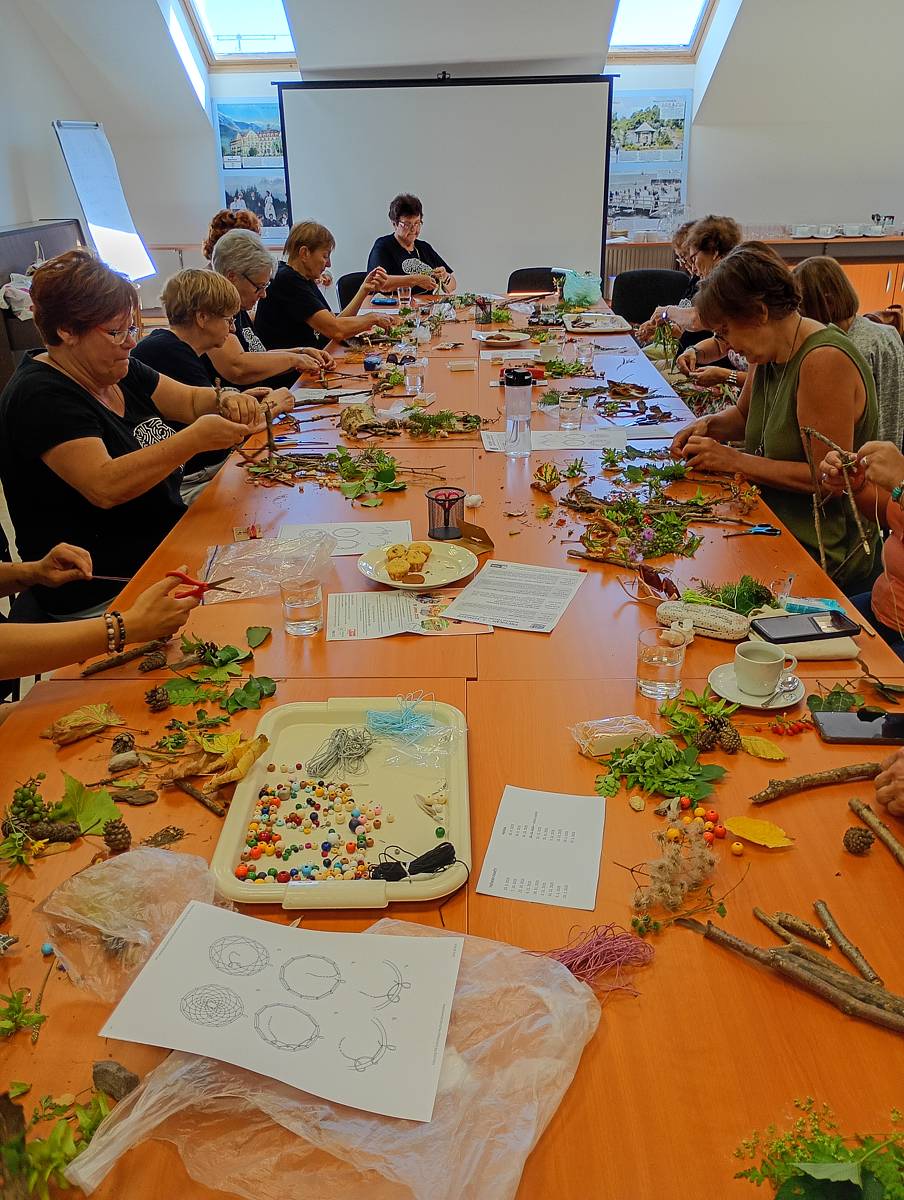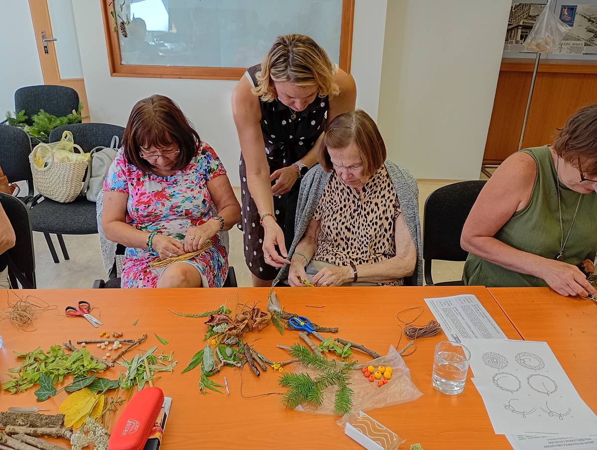 Odpočatí a příjemně naladění po vycházce i společném obědě se senioři pustili do kreativní aktivity, kterou pro ně připravila knihovnice Petra Haitová z Metodického oddělení pro knihovny MěK Znojmo. Z přírodnin nasbíraných v Gránicích si každý účastník vyrobil „lapač okamžiků“ a na konci bylo opravdu na co se dívat – vytvořená díla předčila všechna očekávání a byla krásná svou pestrostí a originalitou.