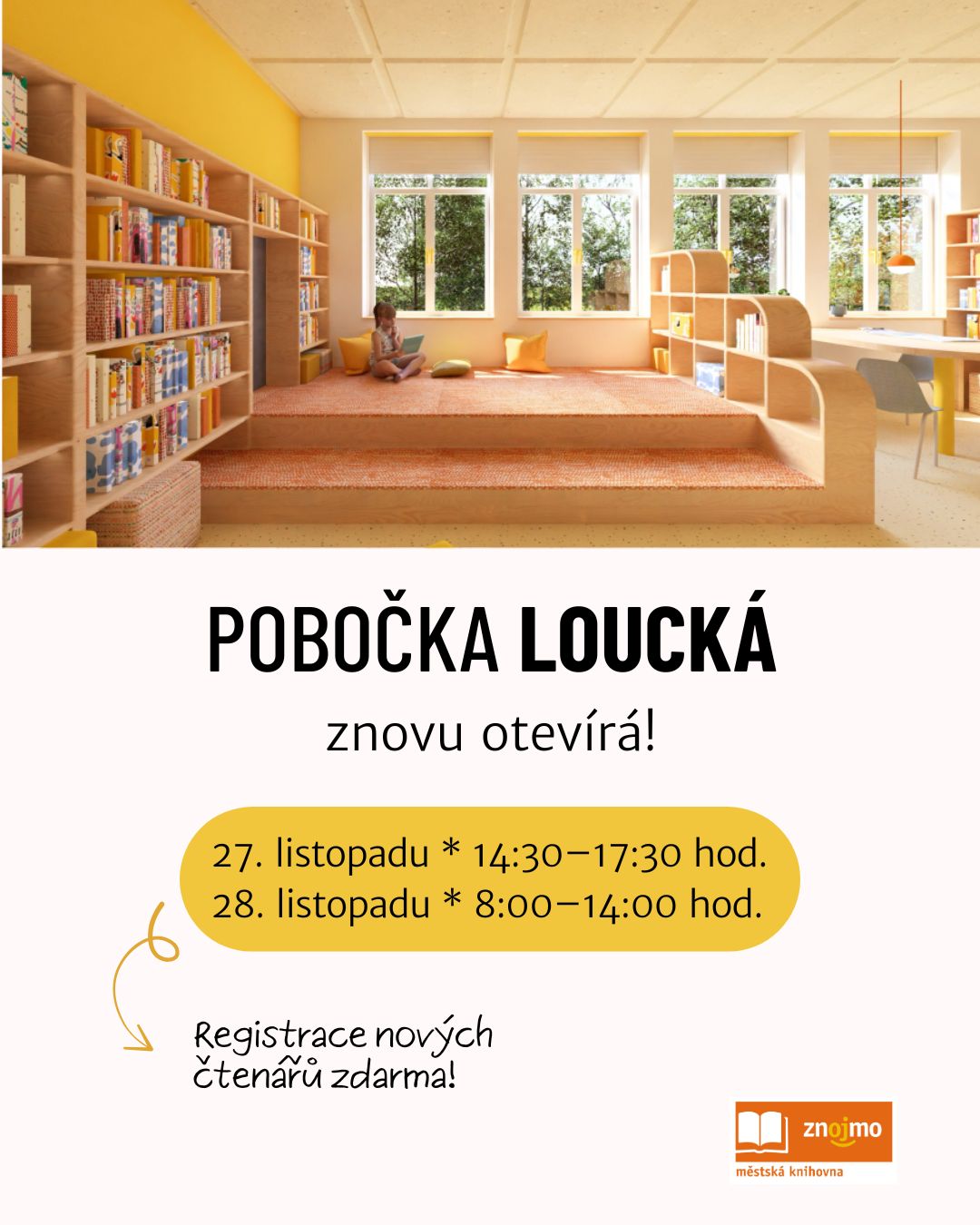 27. listopadu otevíráme krásně zrekonstruovanou pobočku na Loucké. V tento i následující den registrujeme nové čtenáře zdarma.