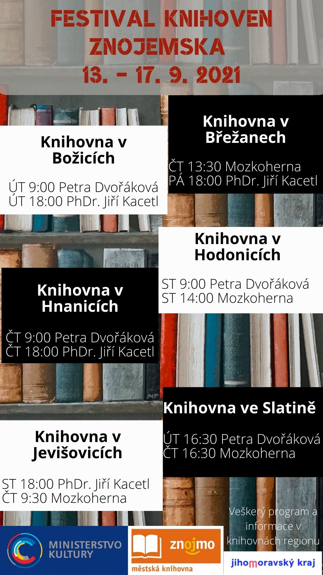 Letošní projekt regionálního oddělení a Měk Znojmo „Festival knihoven Znojemska“ se koná ve dnech 13.-17. 9. 2021. Projekt je financovaný za podpory Jihomoravského kraje a z dotace Knihovna 21. století.