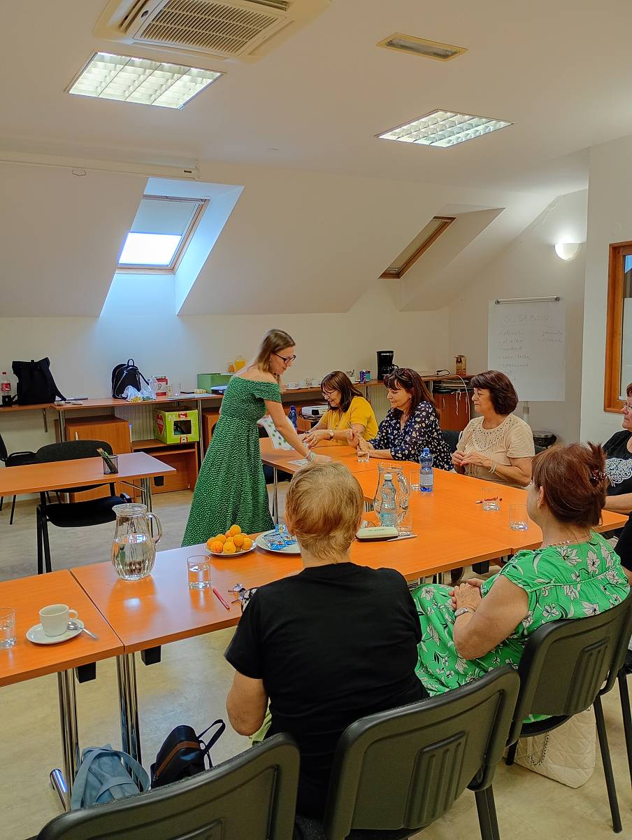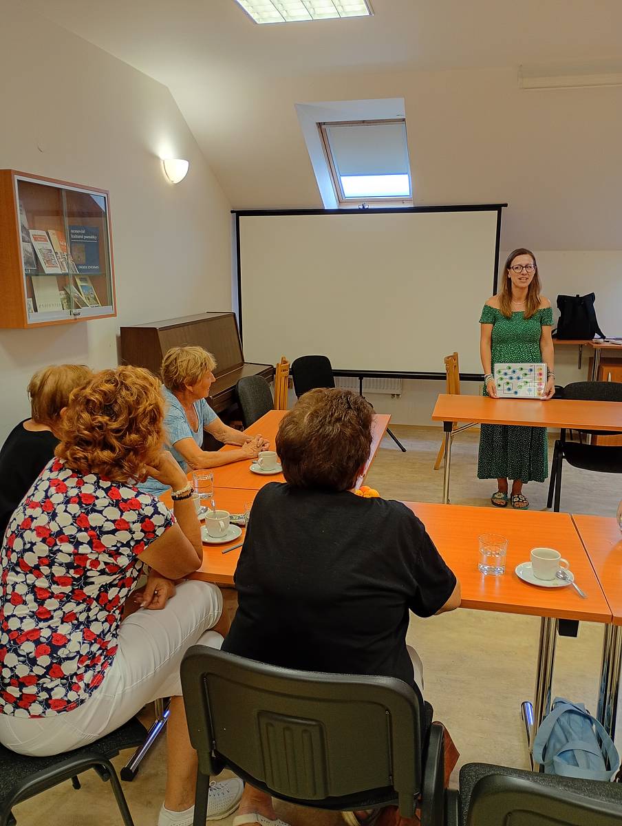 Po společném obědě se účastníci vrátili do sálu knihovny, kde si odpočinuli u volitelné tvořivé aktivity a následně se nechali knihovnicí z oddělení pro děti Mgr. Monikou Mandátovou provést ukázkovou lekcí tréninku kognitivních funkcí – paměti, pozornosti, vnímání, kreativity, verbálního vyjadřování a dalších.