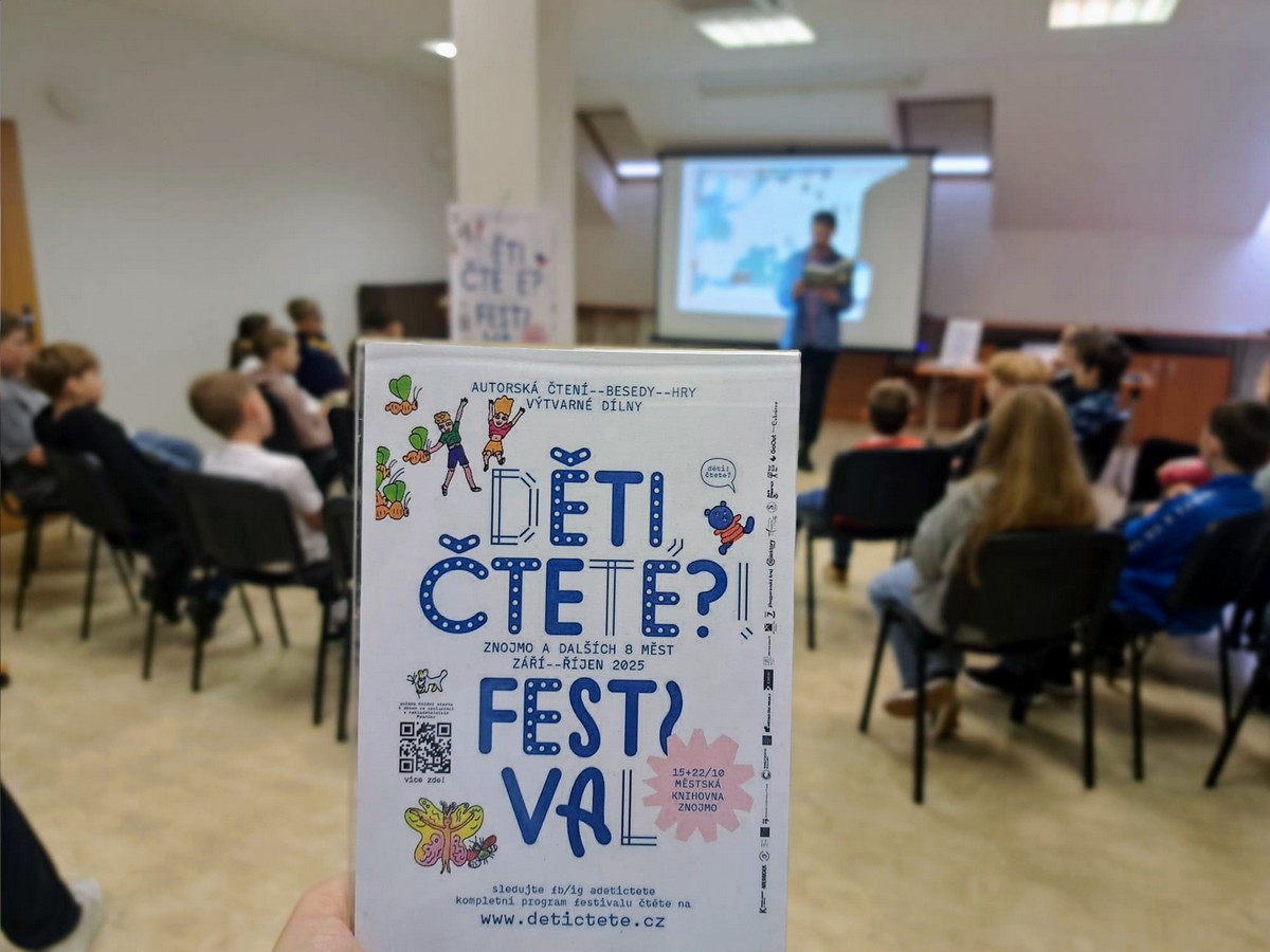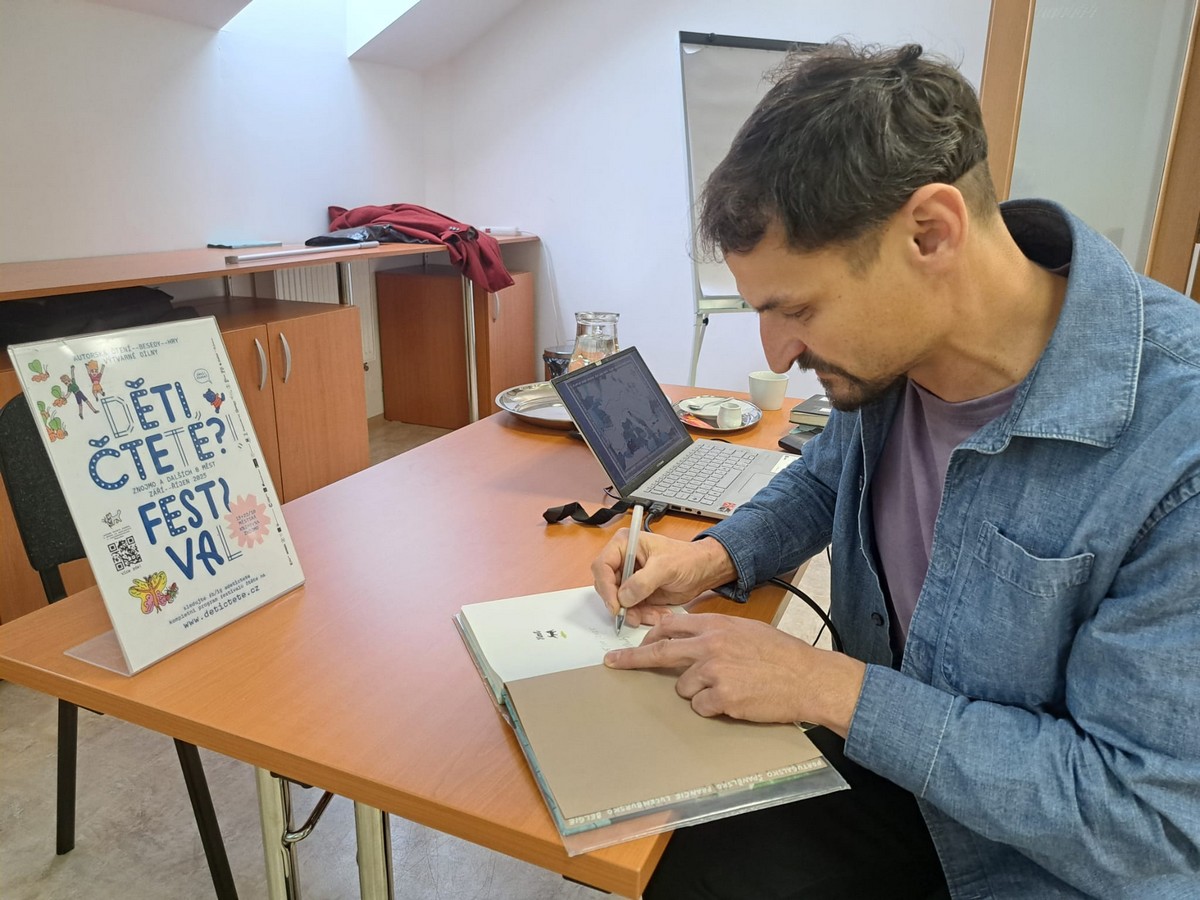 Znojemští páťáci si nenechali ujít jeho autorské čtení. Seznámili se s knihou Cesta je pes a nahlédli pod pokličku jejího zrodu. Viděli fotky skutečného cestovatele Barnabáše – psa, který inspiroval autora k napsání knihy a procestoval s ním Evropu v obytném autě.