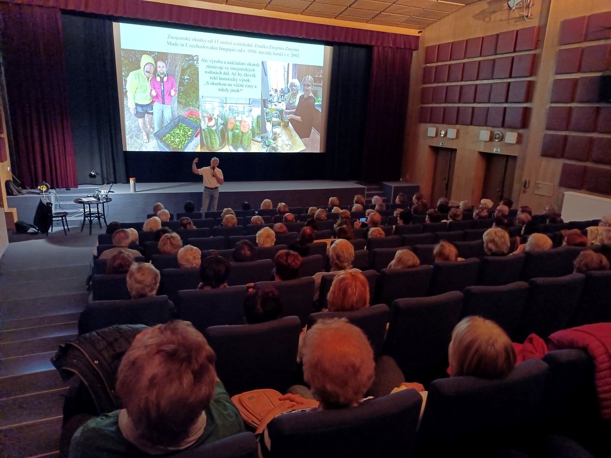 Přednáška začala krátkým historickým exkurzem – odkud a kdy se ve Znojmě okurky vůbec vzaly, jak se vyvíjelo jejich zpracování i jak nepříliš šťastně jejich příběh (aspoň co se týče velkovýroby) u nás skončil. Poté se již pan přednášející přesunul do daleké Indie a s využitím velkého množství fotografií i videí představil svou cestu. Popsal nejen krásné a dechberoucí chvíle v horských vesničkách a na stezkách s vodopády nebo zajímavé zážitky u posvátné řeky Gangy či u poustevníka v horské svatyni. Ale i blízké setkání s lidskou bídou ve městech, které člověka přivádí k otázkám a zamyšlení.