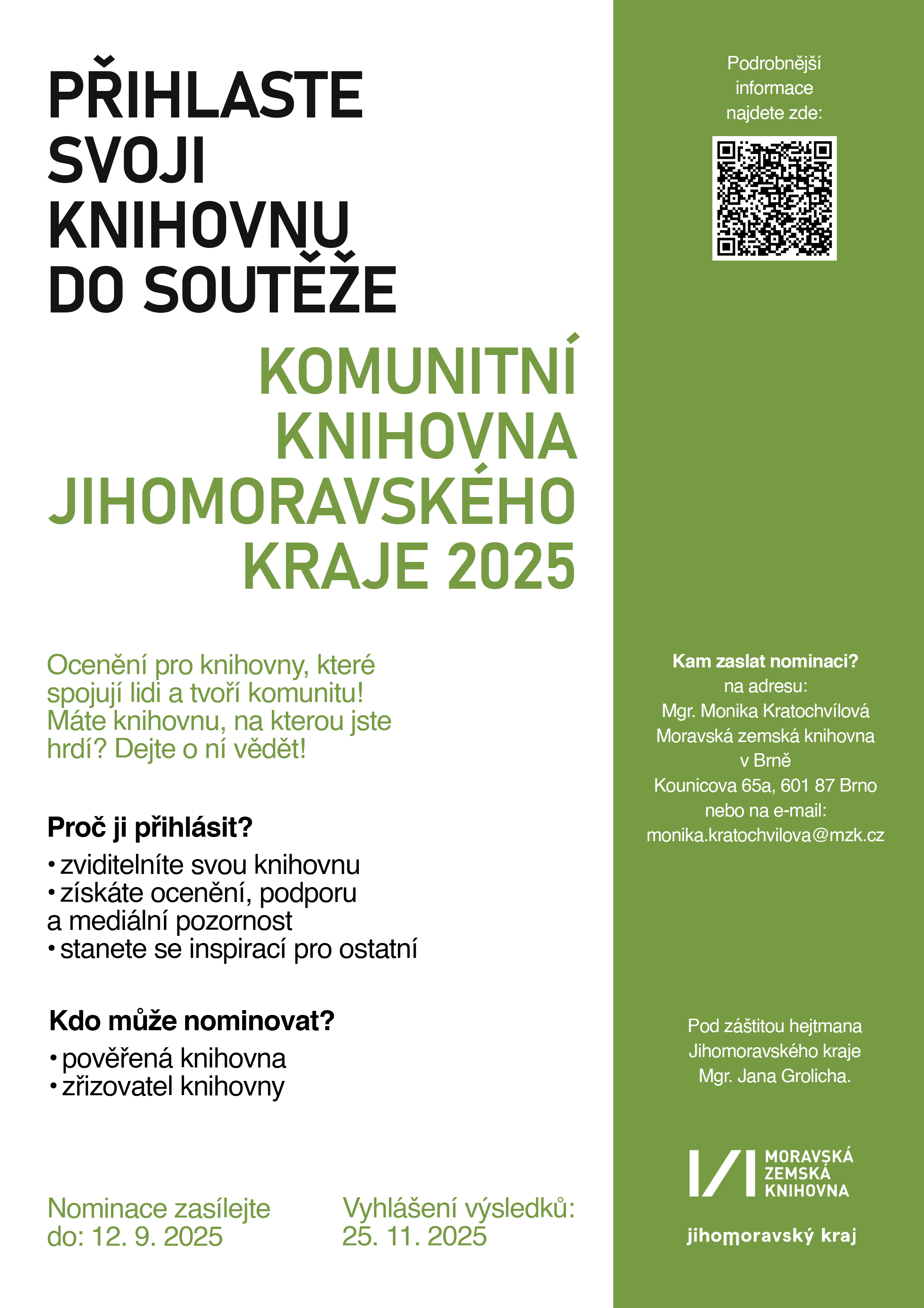 KOMUNITNÍ KNIHOVNA JIHOMORAVSKÉHO KRAJE 2025 a TOP KOMUNITNÍ KNIHOVNA JIHOMORAVSKÉHO KRAJE 2025 spolu s výzvou k nominaci na ocenění KNIHOVNICKÁ OSOBNOST JIHOMORAVSKÉHO KRAJE 2025.